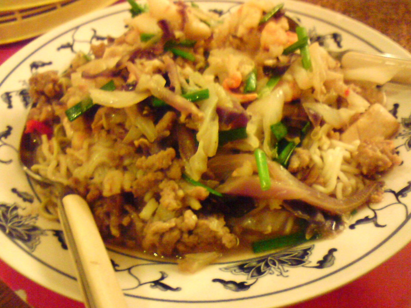 A platter of cabbages, minced meat, maggi noodles, green noodles, bean curd, prawns, spring onions AND soup. I gotta admit that sometimes her cooking really sucks but this one is a little special. I don't know what she calls it... but it is nice.
